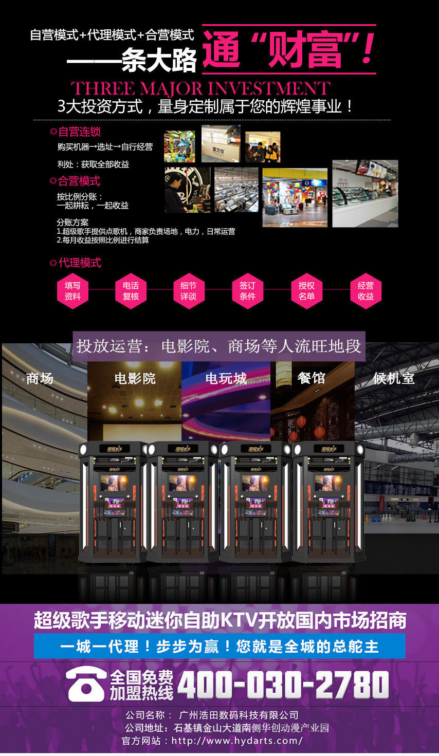 廣州浩田數(shù)碼科技是一家集數(shù)碼軟件開發(fā),高科技產(chǎn)品研發(fā)實力供應(yīng)商!擁有自己的生產(chǎn)廠房設(shè)備,主營產(chǎn)品為超級歌手點唱機、酒吧飛鏢機、自助證件快照機、自助復(fù)印機等的生產(chǎn)制造為一體的現(xiàn)代化高科技綜合性企業(yè)。公司以“引導(dǎo)娛樂創(chuàng)意新潮流、創(chuàng)造娛樂文化新理念”為宗旨。以“客戶的滿意”為目標,以質(zhì)量求發(fā)展,以品牌為中心,以研發(fā)為動力,用高度的敬業(yè)精神和專業(yè)的服務(wù)水準,準確而直接的把握市場方向,追求圓滿、創(chuàng)造深度。 “科技創(chuàng)新求發(fā)展”,是浩田執(zhí)著的追求。公司現(xiàn)向面全國尋求合作伙伴,合作模式包括:代理加盟,工廠批發(fā),工廠定制、OEM貼牌等。歡迎各界朋友蒞臨參觀、指導(dǎo)和業(yè)務(wù)洽談,讓我們最終實現(xiàn)共贏!