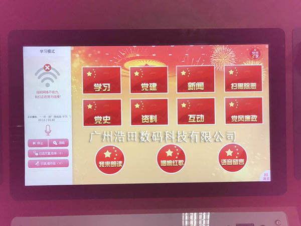 廣州浩田有限公司為機關單位訂購的紅色朗讀亭,并通過紅色學習朗讀亭以“紅愛國”“黨建”“掃黑除惡”“黨風廉政”為主題,將朗讀與紅色教育碰撞火花。紅色學習亭整體機身采用紅色,與黨和國家的主題相符合。內容圍繞黨史/黨風廉政/新聞/學習等多方面進行。