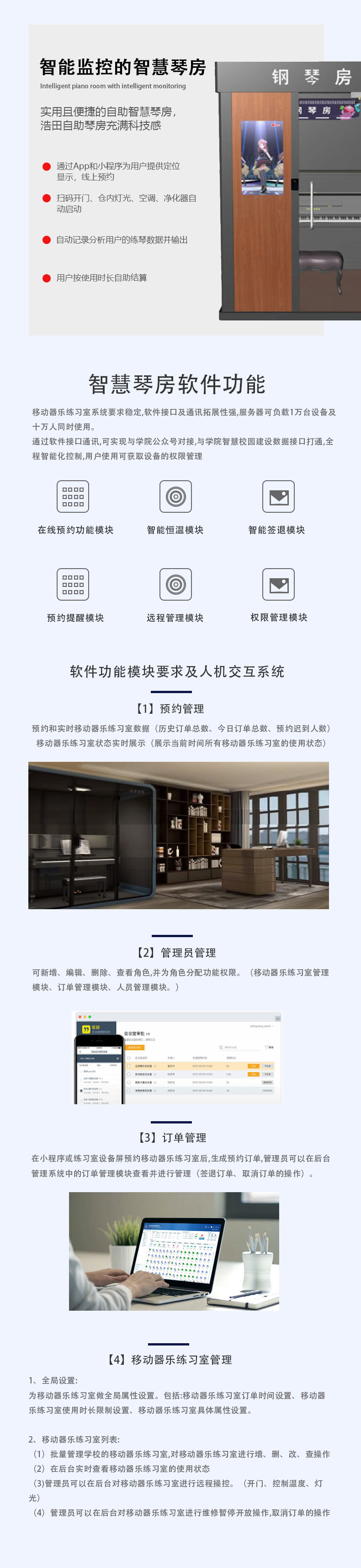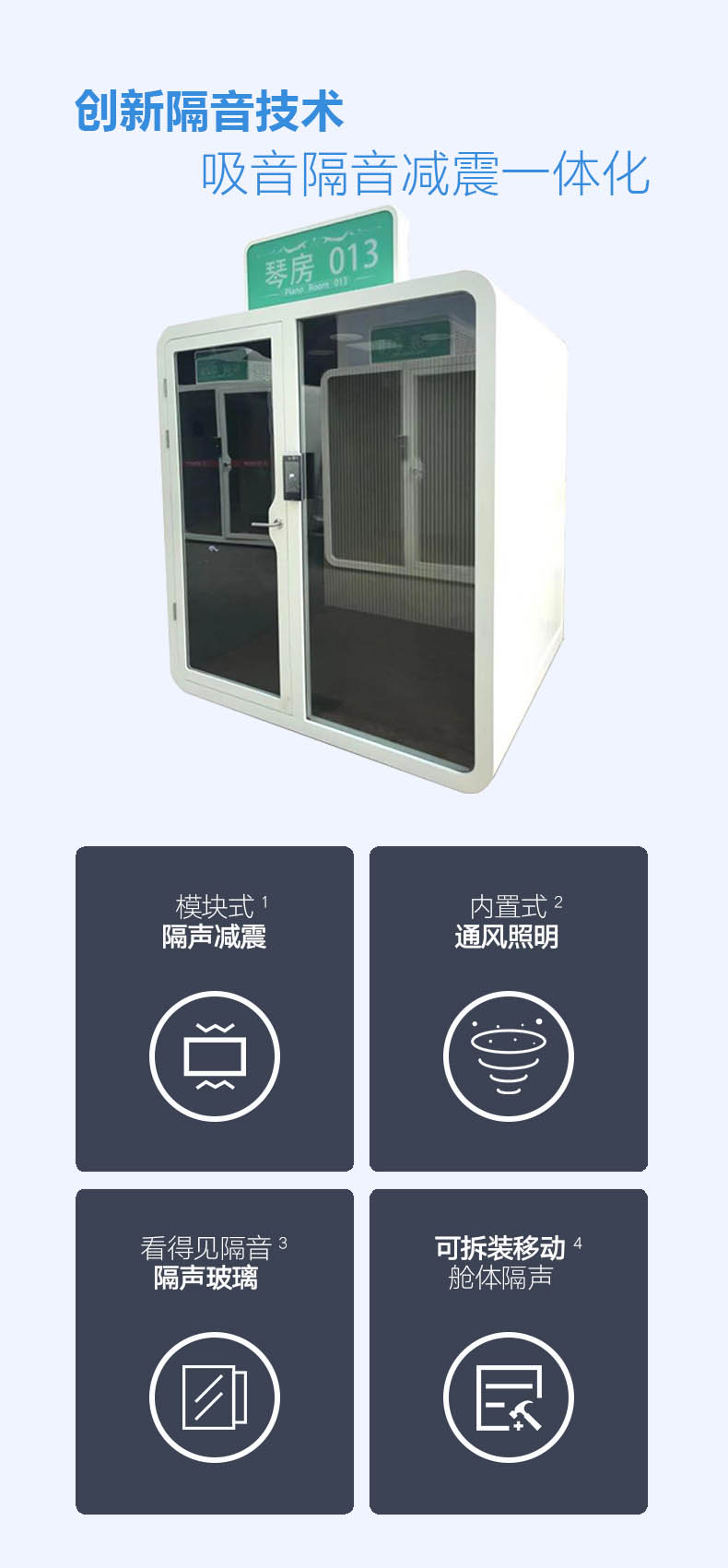 .可以通過App和小程序為用戶提供定位顯示,線上預約、掃碼開門、倉內燈光、空調、凈化器自動啟動,自動記錄分析用戶的練琴數據并輸出建議指導,用戶按使用時長自助結算,是一款很實用且便捷的自助智慧琴房,浩田自助琴房令充滿科技感.