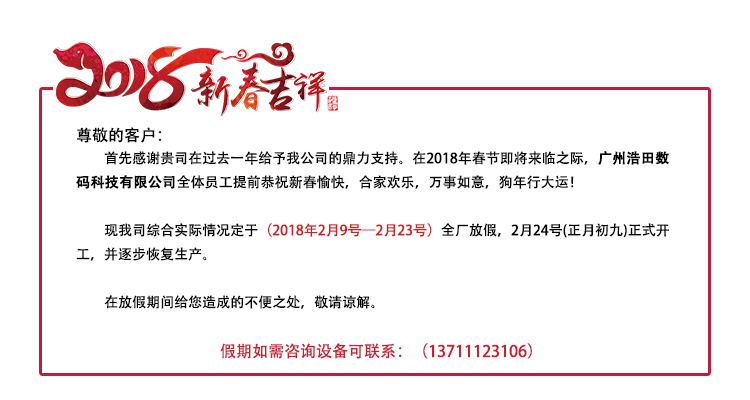 首先感謝貴司在過(guò)去一年給予我公司的鼎力支持。在2018年春節(jié)即將來(lái)臨之際,廣州浩田數(shù)碼科技有限公司全體員工提前恭祝新春愉快,合家歡樂(lè),萬(wàn)事如意,狗年行大運(yùn)! 現(xiàn)我司綜合實(shí)際情況定于2018年2月9號(hào)(十二月二十三)至2月23號(hào)(正月初八)全廠放假,2月24號(hào)(正月初九)正式開(kāi)工,并逐步恢復(fù)生產(chǎn)。