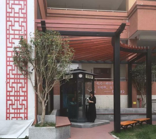 朗讀亭,座落在學(xué)校科學(xué)樓前的東邊草坪邊上,外形似復(fù)古電話亭,溫暖大氣,讓人神往。它占地約2平方米,可謂麻雀雖小五臟俱全——專業(yè)的音響系統(tǒng)、電子屏幕、氛圍燈光一應(yīng)俱全,系統(tǒng)自帶大量的數(shù)字朗讀資源:每學(xué)期必讀書籍中的某些篇章或古詩(shī)詞,語(yǔ)文教材中的某篇課文及節(jié)選,以及教育部推薦的網(wǎng)絡(luò)閱讀平臺(tái)中的中華經(jīng)典等多種類型的書目供選擇。每位朗讀者進(jìn)門后對(duì)著麥克風(fēng)就可以開(kāi)始朗讀自己心目中的好文章。