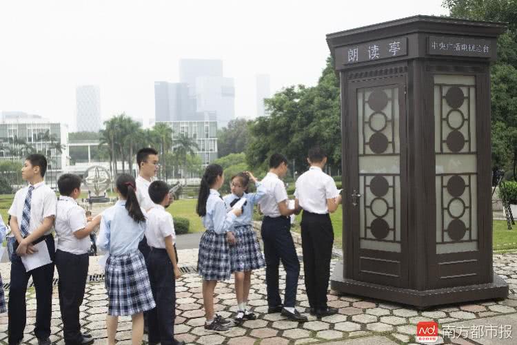 深圳外國語學(xué)校的同學(xué)來到深圳大學(xué)體驗(yàn)朗讀亭,同學(xué)們在朗讀亭門外排隊(duì)。